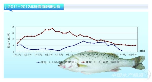 中國水產頻道據《水產前沿》雜志消息,11月中旬,珠海海鱸1.1斤規格鮮活魚(走水車)為7-7.2元/斤,1.4-1.5斤規格冰鮮魚為6.4元/斤,2斤以上的舊魚冰鮮級為7.7元/斤,較上月同期再次有1元/斤以上的降幅。