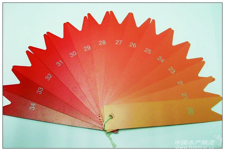 這是在業界出現的比色卡,編號從20-34,囊括商品紅魚的所有顏色。編號34被稱為“黑紅”色調:29-30被稱為“清紅”:20為色澤不夠,需要延長喂食色素飼料的時間