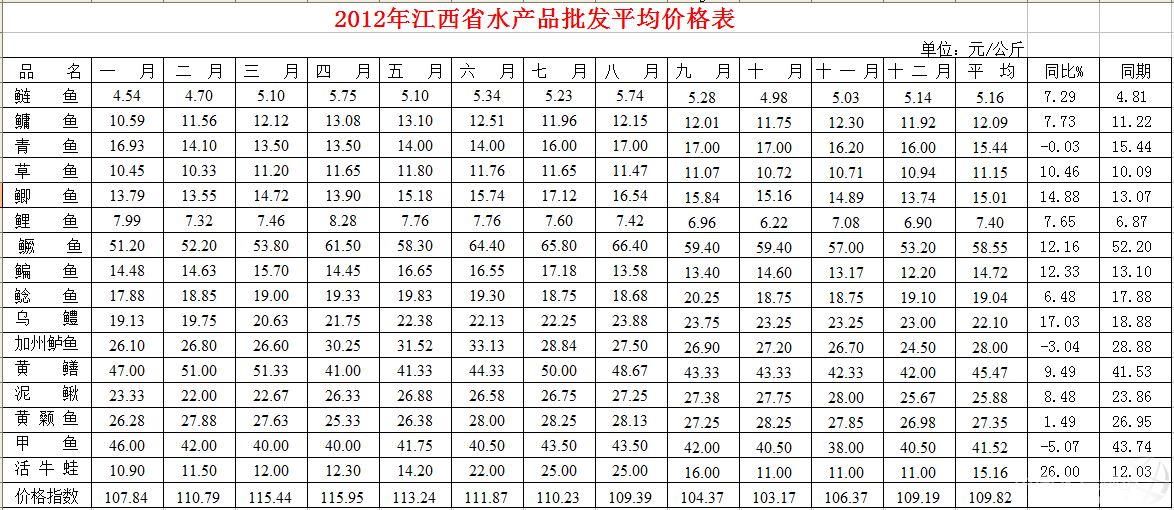 2、市場批發價格方面:經對江西省內3個部級定點水產采集批發市場及2個省級定點水產采集批發市場的16個水產養殖品種的價格監測,2012年全省水產品批發價格指數為109.82,同比上漲了9.82個百分點。在所有監測品種中,只有3個品種下跌,分別是甲魚(41.52元/公斤,下跌5.07%)、加州鱸魚(28.00元/公斤,下跌3.04%)和青魚(15.44元/公斤,下跌0.03%),其余監測品種同比均上漲。上漲前五位的是:養殖蛙類(15.16元/公斤,漲26.00%)、烏鱧(22.10元/公斤,漲17.03%)、鯽魚(15.01元/公斤,漲14.88%)、鳊魚(14.72元/公斤,漲12.33%)、鱖魚(58.55元/公斤,漲12.16%)(詳見附表)。