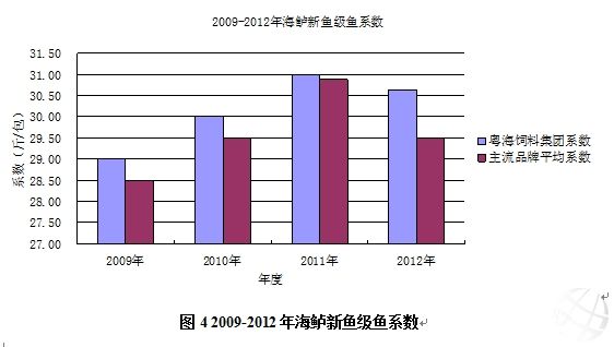 從圖2和圖3統(tǒng)計(jì)的數(shù)據(jù)來看,可明顯發(fā)現(xiàn): 1、各種規(guī)格存塘量最少的時(shí)間段是7-9月,這個(gè)時(shí)間段也是價(jià)格最好的黃金時(shí)段,但存在風(fēng)險(xiǎn),固定的需求量和暫短的時(shí)間是制約著客戶擴(kuò)增養(yǎng)殖量的關(guān)鍵因素; 2、2012年春節(jié)前的一段時(shí)間(1月-2月初)的供應(yīng)量已經(jīng)達(dá)到飽和,雖然2-3月的存塘量略有減少,但價(jià)格仍然大幅度下滑; 3、除了春節(jié)期間(1月中-2月底)外,海鱸的價(jià)格與存塘量存在反比的關(guān)系,即隨著存塘量的增加,海鱸的價(jià)格會(huì)迅速下滑,反之亦然; 4、級(jí)魚(1.0-1.5斤/尾)的價(jià)格變動(dòng)最頻繁,其次中魚(1.5-2.0斤/尾),大魚的價(jià)格相對(duì)穩(wěn)定,特別是中后期。 海鱸新魚級(jí)魚系數(shù)統(tǒng)計(jì)分析 2009-2011年,這三年不僅是客戶養(yǎng)殖海鱸大獲豐收的時(shí)段,而且是各主要飼料集團(tuán)或公司大浪淘沙后的見證。經(jīng)過這三年的完善發(fā)展和激烈競(jìng)爭(zhēng),各主流飼料品牌的配方技術(shù)都有不少的改進(jìn),使海鱸的餌料系數(shù)都相應(yīng)提高了不少,也逐漸覆蓋了市場(chǎng),成為市場(chǎng)的中流砥柱,特別是粵海飼料集團(tuán)。 雖然2011年因?yàn)樵蟽r(jià)格的回落(特別是魚粉價(jià)格的回落),各主流品牌海水魚配合飼料的海鱸新魚級(jí)魚的出魚系數(shù)都有很大的提高,并且彼此之間的差異性不顯著,但依據(jù)多年的調(diào)查統(tǒng)計(jì)數(shù)據(jù),各主流品牌海水魚配合飼料在海鱸新魚級(jí)魚出魚的餌料系數(shù)的差異性是存在的(見圖4)。果然不出所料,2012年5月中旬由于原材料價(jià)格的不斷上漲(特別是魚粉、豆粕),各主流飼料品牌的質(zhì)量都有相應(yīng)的調(diào)整,以致9月底海鱸新魚級(jí)魚的出魚系數(shù)參差不齊,差異性顯著。 圖4 2009-2012年海鱸新魚級(jí)魚系數(shù)