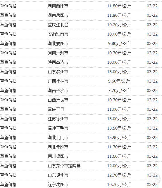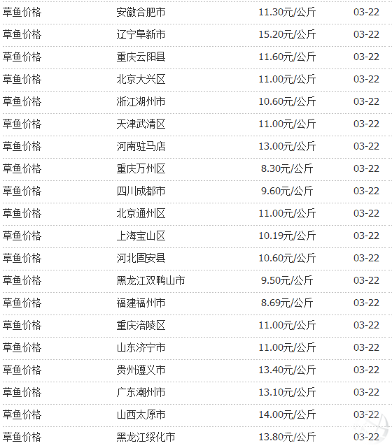 3月22日國內(nèi)部分地區(qū)草魚價(jià)格統(tǒng)計(jì)