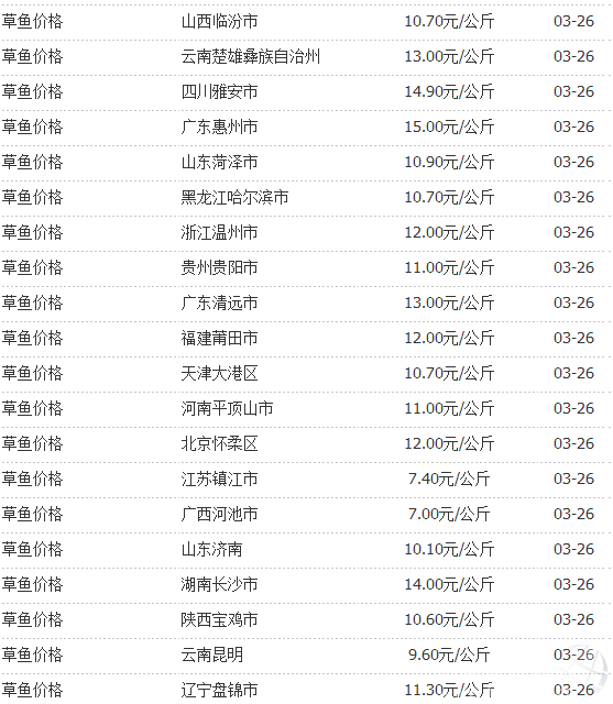 中國水產頻道獨家報道,3月26日國內部分地區草魚價格統計如下: