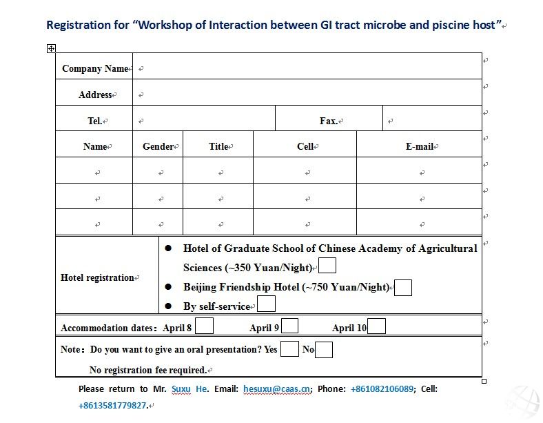 WORKSHOP Interaction between GI tract microbe and piscine host 消化道微生物與魚源宿主互作國(guó)際研討會(huì) Beijing, China•9-10 April 2013 ORGANIZER 1Innovative Direction of Aqua Feed & Feed Additive, 2Key Laboratory for Feed Biotechnology of the Ministry of Agriculture, Feed Research Institute of Chinese Academy of Agricultural Sciences Background: A more complete use of food resources and available space is achieved in the present aquaculture system, particularly in China. However, such aquaculture mode always results in high stocking density and consequently may depress the immune system (cellular and humoral immune) of piscine host and increases their susceptibility to diseases. It has been known that the gut microbe plays an important role in providing nutrients, regulating epithelial development, and instructing innate immunity. However, although more and more scientists are revealing the full pictures of these biological effects, we still know few about the characterization/mechanism of these interactions. The purpose of this workshop is attempted to provide an overview of “Interaction between GI tract microbe and piscine host”, including (but not limited to); a) Techqiues to encode gut microbe; b) The physiological structures of fish gastrointestines and where is the gut microbe (allo, auto, invasion, translocation, etc.); c) Interaction between gut microbe and host fish (nutrition, immunity, disease protection, endocrine, etc.); d) Different testing models (in vivo, in vitro, ex vivo, cells; gnobiotic animals); e) The future of this field. Organized by: Innovative Direction of Aqua Feed & Feed Additive, Key Laboratory for Feed Biotechnology of the Ministry of Agriculture, Feed Research Institute of Chinese Academy of Agricultural Sciences. Supported by: The Technology Support Program Project of China (grant #2012BAD25B02); The Modern Agricultural Industry Technology System of Beijing City (grant #SCGWZJ 20121104-4); The 948 project of MOA, China (grant #2012-Z8); The National Natural Science Foundation of China (grant #31272672). Exclusive sponsorship: Novus International, Inc. Venue/Contact: The conference room in the1st floor of the Feed Research Institute of Chinese Academy of Agricultural Sciences, Beijing, China; Mr. Suxu He, email: hesuxu@caas.cn, phone: +86-10-82106089. PROGRAM Tuesday 9 April Wednesday 10 April |