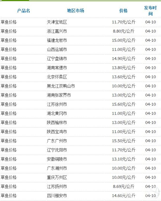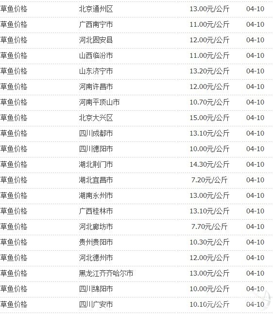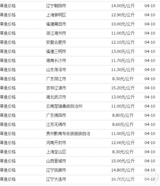 中國水產頻道獨家報道,4月10日國內部分地區草魚價格統計如下: