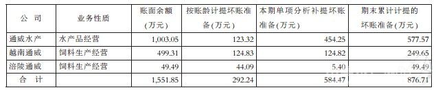 (1)ERDOGAN公司欠通威水產有限公司貨款850.96萬元,系通威水產有限公司的魚片出口到美國,委托他人代售,但魚片銷售滯后,庫存時間長,質量、價格受到較大影響,保管費用高,預計收回凈額不會低于欠款金額的50%,故按50%計提壞賬準備,扣除按賬齡分析已計提壞賬準備85.30萬元,本期單項分析補提壞賬準備340.18萬元。通威水產有限公司另一客戶因違反合同約定拖欠貨款152.09萬元,該款項預計無法收回,公司本著謹慎性原則,本年度全額計提壞賬,扣除按賬齡分析已計提壞賬準備38.02萬元,本年單項分析補提壞賬準備114.07萬元。 (2)ERDOGAN公司欠越南通威有限責任公司貨款499.31萬元,系越南通威有限責任公司出口魚片到美國,委托他人代售,但魚片銷售滯后,庫存時間長,質量、價格受到較大影響,保管費用高,預計收回凈額不會低于欠款金額的50%,故按50%計提壞賬準備,扣除按賬齡分析已計提壞賬準備124.83萬元,本期單項分析補提壞賬準備124.82萬元。 (3)重慶市涪陵通威飼料有限公司5家客戶共計欠飼料款49.49萬元,已進入訴訟催收程序,參照聘請律師意見,對該部分款項按損失金額全額計提壞賬準備,扣除按賬齡分析計提壞賬準備44.09萬元,本年單項分析補提壞賬準備5.40萬元。 2、庫存商品(食品)計提減值 根據企業會計準則及公司會計政策的相關規定,公司對下述幾家子公司的庫存商品、包裝材料參照市場售價扣除相關稅費用后預計可收回金額,測算并計提減值準備429.29萬元,分單位、商品種類列示如下: