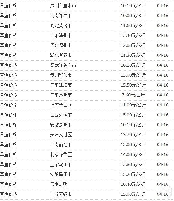 4月16日國內部分地區草魚價格統計