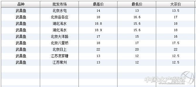 中國水產頻道獨家報道,6月9日全國主要批發市場武昌魚價格行情如下: