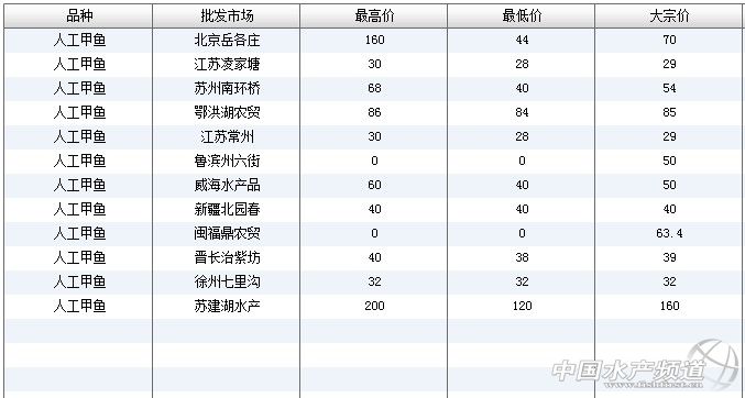 中國水產頻道獨家報道,6月18日全國主要批發市場人工甲魚價格行情如下: