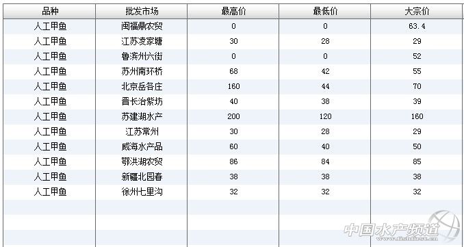 中國水產頻道獨家報道,6月20日全國主要批發市場人工甲魚價格行情如下:
