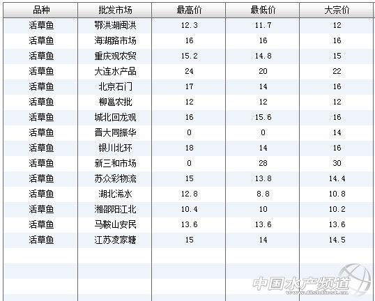 中國(guó)水產(chǎn)頻道獨(dú)家報(bào)道,6月27日全國(guó)主要批發(fā)市場(chǎng)活草魚(yú)價(jià)格行情如下: