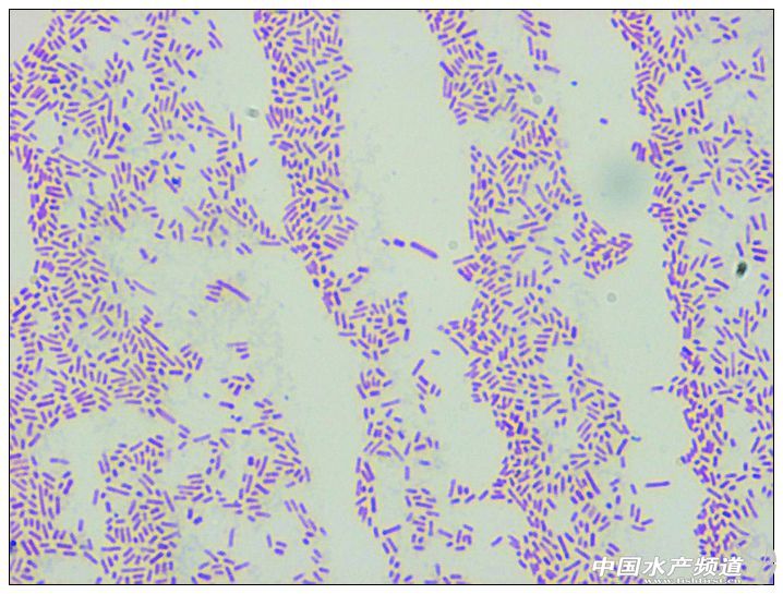 5尾魚的腹水、肝臟、和腎臟中均培養出大量的細菌,且形態大小基本一致,革蘭氏染色為陰性、兩端鈍圓、散在或成雙排列的桿菌(見圖5),經16SrDNA測序鑒定為鮰愛德華氏菌(Edwardsiellaictaluri),藥敏結果顯示,該分離菌對“可代金”、“多康素”、“鰓膚康”、“出敗康”、“鰓皮腸利康”、“氟多力”等藥物敏感。