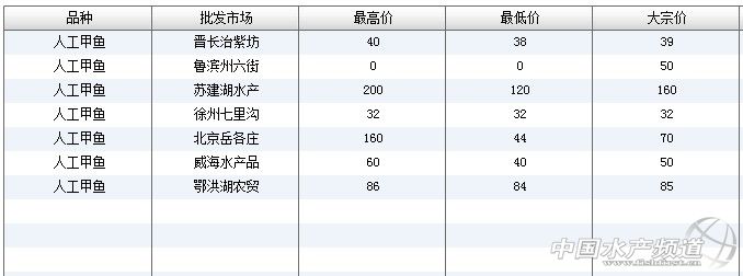 中國水產頻道獨家報道,7月8日全國主要批發市場人工甲魚價格行情如下: