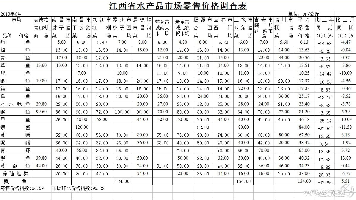 中國水產頻道獨家報道,2013年的1-6月份,對江西的水產養殖業來說,基本上是風調雨順,漁業生產基本順利。上半年,江西水產品總產量達到105.41萬噸,同比增2.51%,其中養殖產量96.73萬噸,同比增2.51%,捕撈產量8.68萬噸,同比增2.50%。各地水產品市場供應充足,價格平穩。“三大價格”(零售市場價格、批發市場價格和塘邊起水價格)呈現出漲跌互現,總體穩中微漲的局面。“三大價格”平均指數為101.29,水產品價格具體特點是:大宗水產品持續微漲,仍是市場消費主體;名優水產品價格漲跌互現,部分品種漲幅和跌幅較大,消費需求選擇性明顯。