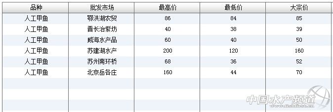 中國水產頻道獨家報道,7月9日全國主要批發市場人工甲魚價格行情如下: