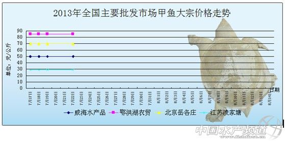 中國(guó)水產(chǎn)頻道獨(dú)家報(bào)道,7月22日全國(guó)主要批發(fā)市場(chǎng)甲魚價(jià)格行情如下: (中國(guó)水產(chǎn)頻道水產(chǎn)價(jià)格信息共享Q群:245296163,歡迎提供各種水產(chǎn)品一線價(jià)格信息!) 【關(guān)鍵字】:甲魚 價(jià)格行情 批發(fā)市場(chǎng) 中國(guó)水產(chǎn)頻道(m.fuqitext.com)獨(dú)家報(bào)道,轉(zhuǎn)載請(qǐng)說明出處,違者追究法律責(zé)任, 謝謝合作。 |
