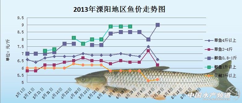 中國水產頻道獨家報道,據海大集團華東魚料部提供資料顯示,7月江蘇溧陽地區草魚價格情況如圖所示: