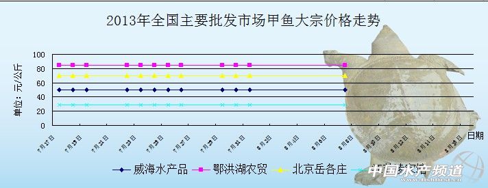 中國水產頻道獨家報道,8月7日全國主要批發市場甲魚價格行情如下: 全國主要批發市場大宗價格 日期 產品 批發市場 大宗價格 單位 甲魚 湖北洪湖農貿 85 元/公斤 甲魚 江蘇建湖水產 160 元/公斤 甲魚 江蘇凌家塘 29 元/公斤 甲魚 江蘇常州 30 元/公斤 甲魚 江蘇蘇州南環橋 52 元/公斤 甲魚 江蘇徐州七里溝 32 元/公斤 甲魚 北京岳各莊 70 元/公斤 甲魚 山西長治紫坊 38 元/公斤 甲魚 山東威海水產品 50 元/公斤 甲魚 山東濱州六街 52 元/公斤 甲魚 新疆北園春 30 元/公斤 甲魚 福建福鼎農貿 64.4 元/公斤 (中國水產頻道水產價格信息共享Q群:245296163,歡迎提供各種水產品一線價格信息!) | ||||||||||||||||||||||||||||||||||||||||||||||||||||||||||||||||||||||