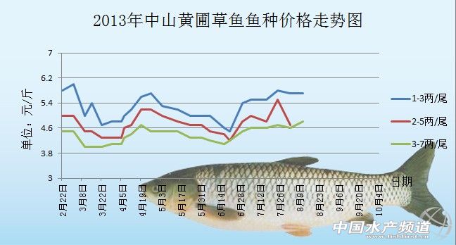 中國水產頻道獨家報道,據海大集團華南魚料部提供資料顯示,8月12日中山黃圃草魚種價格情況如圖所示: