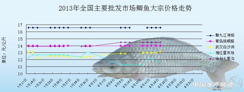 中國水產頻道獨家報道, 8月16日全國主要批發市場鯽魚價格行情如下: 全國主要批發市場大宗價格 日期 產品 批發市場 大宗價格 單位 鯽魚 江西九江潯陽 16.6 元/公斤 鯽魚 湖北浠水 15 元/公斤 鯽魚 湖北武漢白沙洲 13.2 元/公斤 鯽魚 江蘇凌家塘 16.5 元/公斤 鯽魚 江蘇徐州七里溝 14.5 元/公斤 鯽魚 山東威海水產品 22 元/公斤 鯽魚 山東青島撫順路 14 元/公斤 鯽魚 山西大同振華 13 元/公斤 鯽魚 重慶觀農貿 16 元/公斤 鯽魚 四川廣安鄰水 17 元/公斤 鯽魚 安徽馬鞍山安民 15 元/公斤 鯽魚 安徽合肥周谷堆 15.3 元/公斤 鯽魚 湖南益陽團洲 11.5 元/公斤 鯽魚 湖南長沙馬王堆 12.5 元/公斤 鯽魚 湖南紅星市場 11.7 元/公斤 鯽魚 北京石門 17 元/公斤 鯽魚 廣西柳邕農批 16 元/公斤 (中國水產頻道水產價格信息共享Q群:245296163,歡迎提供各種水產品一線價格信息!) | |||||||||||||||||||||||||||||||||||||||||||||||||||||||||||||||||||||||||||||||||||||||||||||||