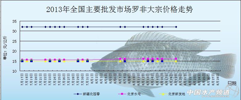 中國水產頻道獨家報道,8月19日全國主要批發市場羅非魚價格行情如下: 全國主要批發市場大宗價格 日期 產品 批發市場 大宗價格 趨勢 單位 羅非魚 新疆北園春 32 元/公斤 羅非魚 北京新發地 15 元/公斤 羅非魚 北京水屯 16 元/公斤 羅非魚 新疆北園春 32 元/公斤 羅非魚 北京新發地 15 元/公斤 羅非魚 北京水屯 16 元/公斤 羅非魚 新疆北園春 32 元/公斤 羅非魚 北京新發地 15 元/公斤 羅非魚 北京水屯 16 元/公斤 羅非魚 新疆北園春 32 元/公斤 羅非魚 北京新發地 15 元/公斤 羅非魚 北京水屯 16 元/公斤 羅非魚 新疆北園春 32 元/公斤 羅非魚 北京新發地 15 元/公斤 羅非魚 北京水屯 16 元/公斤 (中國水產頻道水產價格信息共享Q群:245296163,歡迎提供各種水產品一線價格信息。 | ||||||||||||||||||||||||||||||||||||||||||||||||||||||||||||||||||||||||||||||||||||||||||||||||||||||