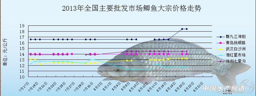 中國水產(chǎn)頻道獨家報道, 8月20日全國主要批發(fā)市場鯽魚價格行情如下: 全國主要批發(fā)市場大宗價格 日期 產(chǎn)品 批發(fā)市場 大宗價格 趨勢 單位 鯽魚 江西九江潯陽 18.4 元/公斤 鯽魚 湖北浠水 15 元/公斤 鯽魚 湖北武漢白沙洲 13.23 元/公斤 鯽魚 江蘇凌家塘 18 元/公斤 鯽魚 江蘇徐州七里溝 14.5 元/公斤 鯽魚 山東威海水產(chǎn)品 22 元/公斤 鯽魚 山東青島撫順路 14 元/公斤 鯽魚 山西大同振華 13 元/公斤 鯽魚 重慶觀農(nóng)貿(mào) 16 元/公斤 鯽魚 四川廣安鄰水 17 元/公斤 鯽魚 安徽馬鞍山安民 16.8 ↑ 元/公斤 鯽魚 安徽合肥周谷堆 15.3 元/公斤 鯽魚 湖南益陽團洲 11.5 元/公斤 鯽魚 湖南長沙馬王堆 12.5 元/公斤 鯽魚 湖南紅星市場 12 元/公斤 (中國水產(chǎn)頻道水產(chǎn)價格信息共享Q群:245296163,歡迎提供各種水產(chǎn)品一線價格信息!) | ||||||||||||||||||||||||||||||||||||||||||||||||||||||||||||||||||||||||||||||||||||||||||||||||||||||