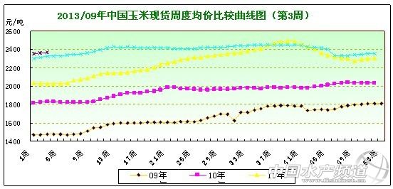 中國水產頻道報道,據上海益農訊,2013年第3周(1月14日-1月18日) 本周,玉米市場購銷逐步升溫,年前采購需求帶動價格上漲。益農監測第1周全國均價在2366.17元/噸,較上周上漲0.24%。