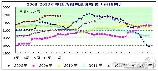 中國水產(chǎn)頻道報道,據(jù)上海益農(nóng)訊,一、市場概述 本周(2013年/4/26-5/3)。本周外盤走勢激烈,CBOT先是大幅拉漲,隨后大幅下跌,弱勢格局不改。適逢五一假期以及目前新季油菜籽上市腳步的臨近,同時產(chǎn)量小幅度的上升,導(dǎo)致長假后的首個工作日國內(nèi)菜粕市場價格總體延續(xù)了節(jié)前的下跌態(tài)勢,國內(nèi)菜粕整體余貨很有限,零散交易,局部港口地區(qū)國產(chǎn)加籽菜粕漲跌互現(xiàn)。本周菜粕均價在2649元/噸左右,周度均價呈穩(wěn)中略跌趨勢。 圖表:2013年5月第1周(4月26日-5月3日,總第18周)中國主要地區(qū)菜粕價格統(tǒng)計(元/噸)