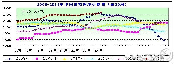中國水產頻道報道,據上海益農訊, 一、市場概述 本周(2013年/7/19-7/26)。本周伴隨著連續幾日CBOT大豆期貨市場的重挫,國內豆粕期現貨市場在高位受到沖擊.雖然本周菜粕近月合約再次刷新近期高點,現貨價格在高位保持穩定,現貨市場供應仍然緊張,對菜粕近月支撐作用較強。受此影響,在周三暫時停歇漲勢,但是短期菜粕近強遠弱的格局很難改變,目前看來可能有進一步擴大的趨勢。同時由于菜籽價格不斷提高,對菜粕價格形成提振作用,以及近期水產養殖對菜粕有所需求,也給菜粕價格起到支撐作用,提振菜粕價格穩中大漲。本周菜粕均價在2775元/噸左右,周度均價呈上漲趨勢。 圖表:2013年7月第4周(7月19日-7月26日,總第30周)中國主要地區菜粕價格統計(元/噸)