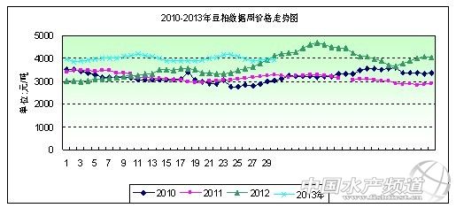 中國水產頻道報道,據上海益農訊, 一、本周市場概述: 2013年第30周(7月19日-7月26日),本周美豆產區整體天氣良好令炒作無力,而市場傳言中國將拋售300萬噸大豆的消息則猶如平地一聲驚雷起,令美豆期價放量下跌。受此拖累,國內豆類跟隨外盤繼續振蕩走勢。同時國內再度出現禽流感病例,導致國內豆粕市場跟盤波動,期現貨情緒較為低迷。國內豆粕價格呈現窄幅震蕩態勢,整體回落。本周國內各地工廠43%蛋白豆粕價格整體運行在3842-4190元/噸之間,整周均價呈略漲態勢。 第30周國內豆粕現貨市場一周情況:周一,漲跌不一;周二,收盤上漲;周三,漲跌不一;周四,收盤下跌;周五,收盤下跌。 第30周(CBOT)外盤行情:周一,收盤上漲;周二,收盤下跌;周三,收盤下跌;周四,收盤下跌。 第30周大商所行情:周一,收盤下跌;周二,收盤上漲;周三,收盤下跌;周四,收盤下跌;周五,收盤下跌。