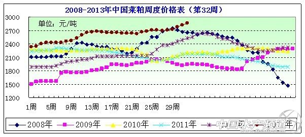 圖表:2013年8月第2周(8月2日-8月9日,總第32周)中國主要地區菜粕價格統計(元/噸)