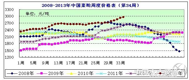 圖表:2013年8月第4周(8月16日-8月23日,總第34周)中國主要地區菜粕價格統計(元/噸)