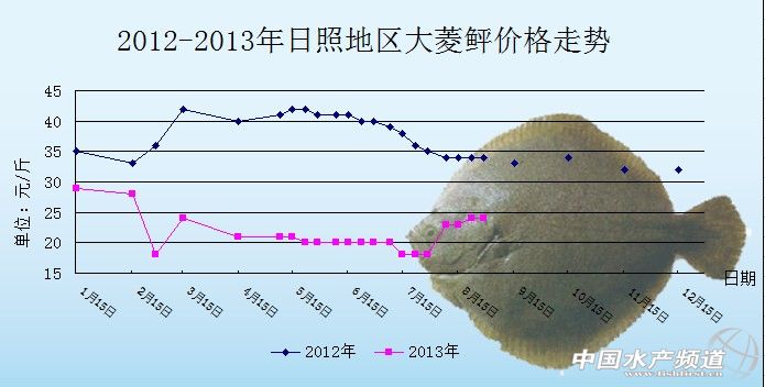 中國水產頻道獨家報道,據青島七好生物科技有限公司提供資料顯示,2013年8月12日,山東日照地區大菱鲆塘頭報價為23元/斤,與上周持平。