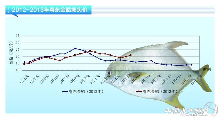 中國水產頻道獨家報道,8月中旬,粵東地區2012投苗的渡冬魚21元/斤,(2013年投苗的)新魚4兩規格10.5-11元/斤;粵西地區價格凍庫魚有0.2-0.3元/斤降幅,凍庫魚300-400g規格9.3元/斤,400-500g規格9.9-10元/斤,500-600g規格10.3元/斤,陽江地區活鮮金鯧魚四兩左右12-12.5元/斤;廣西地區,500-600g規格凍庫魚10.5元/斤,7月份基本無波動,今年出的5-6兩左右的冰鮮魚11.5元/斤,而廣西欽州港受暴雨影響,目前冰鮮魚價在10元/斤左右;海南地區,500g規格的凍庫魚11元/斤,走量和價格上都基本無波動,新魚目前養成到6-7兩規格,售價一般12.5元/斤左右,但是出量不多;庫存方面,海南凍庫魚存量3000噸左右。