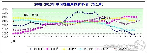 圖表:2013年1月第1周(12月28日-1月4日,總第1周)中國(guó)主要地區(qū)棉粕價(jià)格統(tǒng)計(jì)(元/噸))
