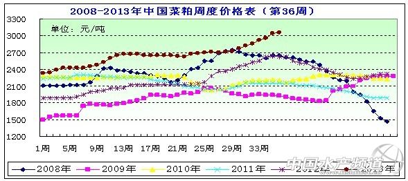 本周(2013年/8/30-9/6)。本周初受干旱天氣炒作強勁,大豆減產(chǎn)成必然,美豆價格上漲,國內豆粕期價強勢上漲,受此影響,菜粕期貨也跟隨上漲。隨后受美豆的下跌影響,國內連盤跟隨下跌震蕩,豆粕低位震蕩,對菜粕期價有造成影響,菜粕期價下跌。但是市場中菜粕現(xiàn)貨依然偏緊,供需不平衡,對菜粕現(xiàn)貨起到支撐作用,局部地區(qū)菜粕價格穩(wěn)中有漲。預計短期菜粕現(xiàn)貨價格震蕩上行。目前菜粕的兩廣工廠多不報價,多陰雨不利菜粕需求,延續(xù)三周以來的持續(xù)有價無市局面。本周菜粕均價在3053元/噸左右,周度均價呈上漲趨勢。