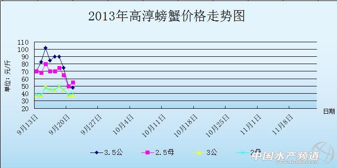 中國水產頻道獨家報道,據網友提供消息,9月21日江蘇高淳河蟹價格行情如下: 螃蟹 日期 地區 規格 價格 單位 9月21日 南京高淳 5公 150 元/斤 9月21日 南京高淳 4.5公 105 元/斤 9月21日 南京高淳 4公 78 元/斤 9月21日 南京高淳 3.5公 48 元/斤 9月21日 南京高淳 3公 38 元/斤 9月21日 南京高淳 2.5公 24 元/斤 9月21日 南京高淳 3.5母 150 元/斤 9月21日 南京高淳 3母 100 元/斤 9月21日 南京高淳 2.8母 75 元/斤 9月21日 南京高淳 2.5母 55 元/斤 9月21日 南京高淳 2母 40 元/斤 9月21日 南京高淳 1.5母 24 元/斤 南京高淳信息由沈生(13770896772)提供,由于價格波動及訂貨量影響,以上價格為最高價格,實際價格請聯系電話。 | ||||||||||||||||||||||||||||||||||||||||||||||||||||||||||||||||||||||