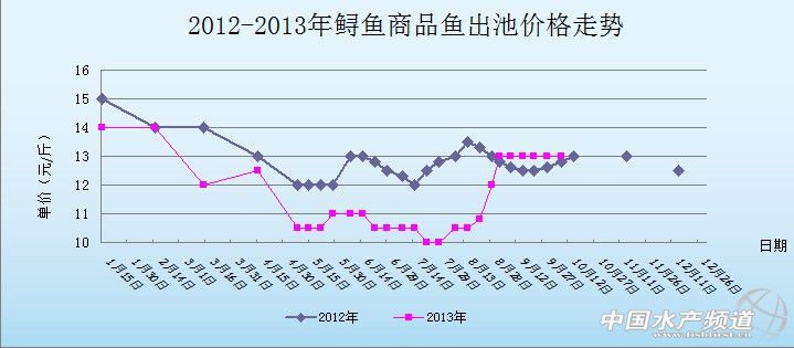 中國水產頻道獨家報道,據青島七好生物科技有限公司提供資料顯示,2013年10月8日,山東冶原地區鱘魚塘頭報價為13元/斤,與上周持平。