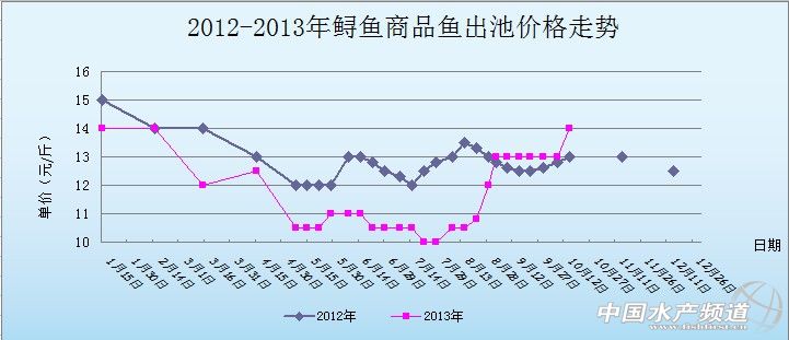 中國(guó)水產(chǎn)頻道獨(dú)家報(bào)道,據(jù)青島七好生物科技有限公司提供資料顯示,2013年10月14日,山東冶原地區(qū)鱘魚(yú)塘頭報(bào)價(jià)為14元/斤,較上周上漲1元/斤。