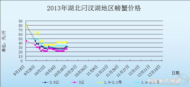 螃蟹 日期 地區 規格 價格 單位 湖北汈汊湖 5公 95 元/斤 湖北汈汊湖 4.5公 62 元/斤 湖北汈汊湖 4公 45 元/斤 湖北汈汊湖 3.5公 32 元/斤 湖北汈汊湖 3公 26 元/斤 湖北汈汊湖 2.5公 21 元/斤 湖北汈汊湖 2公 18 元/斤 湖北汈汊湖 3.1-3.3母 110-115 元/斤 湖北汈汊湖 2.8-3.0母 78 元/斤 湖北汈汊湖 2.5-2.7母 65 元/斤 湖北汈汊湖 2.2-2.4母 58 元/斤 湖北汈汊湖 1.9-2.1母 43 元/斤 湖北汈汊湖 1.6-1.8母 34 元/斤 湖北汈汊湖 1.3-1.5母 30 元/斤 | ||||||||||||||||||||||||||||||||||||||||||||||||||||||||||||||||||||||||||||||||