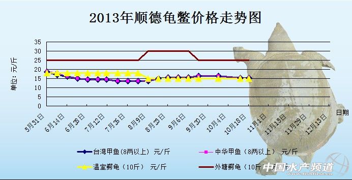 龜鱉 日期 品種 地區 規格 價格 單位 10月18日 臺灣甲魚 廣東順德 8兩以上 15.2 元/斤 10月18日 中華甲魚 廣東順德 8兩以上 15.2 元/斤 10月18日 溫室鱷龜 廣東順德 10斤 15 元/斤 10月18日 外塘鱷龜 廣東順德 10斤 25 元/斤 10月18日 鱷魚龜苗 廣東順德 45 元/只 10月12日 臺灣甲魚 廣東順德 8兩以上 15.2 元/斤 10月12日 中華甲魚 廣東順德 8兩以上 15.2 元/斤 10月12日 溫室鱷龜 廣東順德 10斤 15 元/斤 10月12日 外塘鱷龜 廣東順德 10斤 25 元/斤 10月12日 鱷魚龜苗 廣東順德 45 元/只 10月12日 外塘日本鱉母 浙江杭州 8兩以上 14-14.3 元/斤 10月12日 外塘日本鱉公 浙江杭州 8兩以上 15-17 元/斤 | ||||||||||||||||||||||||||||||||||||||||||||||||||||||||||||||||||||||||||||||||||||
