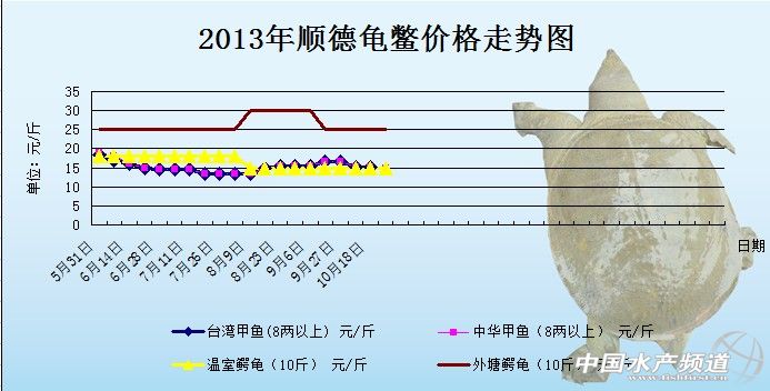 龜鱉 日期 品種 地區 規格 價格 單位 10月29日 中華甲魚 廣東順德 1-1.2以上 14.8 元/斤 10月29日 溫室鱷龜 廣東順德 10斤 15 元/斤 10月29日 外塘鱷龜 廣東順德 10斤 25 元/斤 10月18日 臺灣甲魚 廣東順德 8兩以上 15.2 元/斤 10月18日 中華甲魚 廣東順德 8兩以上 15.2 元/斤 10月18日 溫室鱷龜 廣東順德 10斤 15 元/斤 10月18日 外塘鱷龜 廣東順德 10斤 25 元/斤 10月18日 鱷魚龜苗 廣東順德 45 元/只 10月12日 臺灣甲魚 廣東順德 8兩以上 15.2 元/斤 10月12日 中華甲魚 廣東順德 8兩以上 15.2 元/斤 10月12日 溫室鱷龜 廣東順德 10斤 15 元/斤 10月12日 外塘鱷龜 廣東順德 10斤 25 元/斤 10月12日 鱷魚龜苗 廣東順德 45 元/只 10月12日 外塘日本鱉母 浙江杭州 8兩以上 14-14.3 元/斤