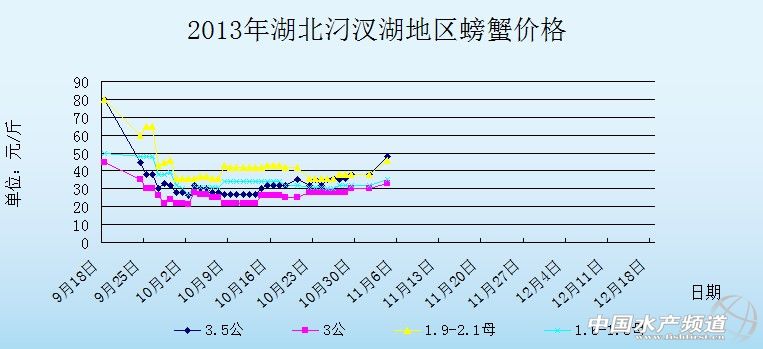 中國(guó)水產(chǎn)頻道獨(dú)家報(bào)道,據(jù)網(wǎng)友提供消息,11月4日湖北汈汊湖主產(chǎn)區(qū)河蟹價(jià)格行情如下: