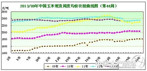 中國水產頻道報道,據上海益農訊,2013年第44周(10月28日-11月1日),國內新糧已經啟動上市,玉米供應量逐日增加,收購方多持謹慎心態,多地價格走弱。益農監測第44周全國均價在2341.56元/噸,較43周下跌0.25%。