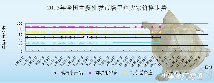 中國水產(chǎn)頻道報道,2013年11月21日江蘇地區(qū)甲魚批發(fā)價格行情如下: