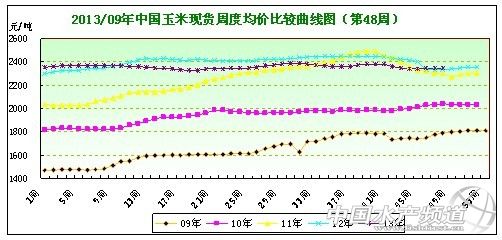中國水產頻道報道,據上海益農訊,2013年第48周(11月25日-11月29日),在收儲明確全面展開,刺激企業及貿易商采購熱情,但供應充裕仍壓制國內玉米現貨市場價格小幅走低。益農監測第48周全國均價在2344.56元/噸,較47周下跌0.20%。 圖表:2013年第48周中國局部市場玉米現貨周度均價比較統計表(單位:元/噸)