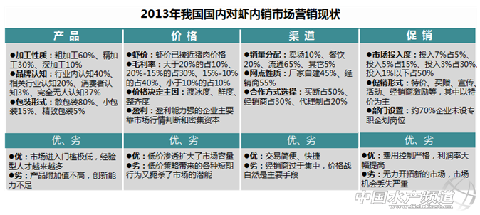 ——原本品牌營(yíng)銷(xiāo)機(jī)構(gòu)研究中心 本文由原本品牌營(yíng)銷(xiāo)獨(dú)家供稿 中國(guó)水產(chǎn)頻道獨(dú)家報(bào)道,近年來(lái)全球范圍的蝦病肆虐、臺(tái)風(fēng)頻襲,各對(duì)蝦產(chǎn)區(qū)產(chǎn)量驟降,對(duì)蝦養(yǎng)殖業(yè)屢受重創(chuàng),2013年全球蝦產(chǎn)量比預(yù)期減少23%。我國(guó)龐大的對(duì)蝦市場(chǎng)供不應(yīng)求,蝦價(jià)上漲;水產(chǎn)養(yǎng)殖戶(hù)大量囤貨以期獲得更好的蝦類(lèi)價(jià)格,直接導(dǎo)致國(guó)內(nèi)市場(chǎng)面臨著蝦價(jià)持續(xù)高漲無(wú)貨可供的緊張局面。蝦類(lèi)原料減少致使供求失衡,惡性競(jìng)爭(zhēng)讓各商家在蝦包冰含量上打主意,致使行業(yè)標(biāo)準(zhǔn)化缺失,種種困境使我國(guó)對(duì)蝦行業(yè)發(fā)展舉步維艱,對(duì)蝦產(chǎn)業(yè)洗牌一觸即發(fā),對(duì)蝦行業(yè)形勢(shì)異常嚴(yán)峻。 從全球來(lái)看,對(duì)蝦產(chǎn)業(yè)經(jīng)歷了從1992年全球產(chǎn)量1百萬(wàn)噸,到2010年的將近400萬(wàn)噸的持續(xù)增長(zhǎng)發(fā)展期,也經(jīng)歷了從2010后到2012年減產(chǎn)9.7%的衰退期。2013年,由于蝦病肆虐,導(dǎo)致東南亞產(chǎn)區(qū)對(duì)蝦產(chǎn)量至少下降40%,墨西哥產(chǎn)量下滑,最大原料市場(chǎng)泰國(guó)今年蝦產(chǎn)量嚴(yán)重不足根本無(wú)法滿(mǎn)足大量國(guó)外市場(chǎng)的供應(yīng)。2013年泰蝦產(chǎn)量25萬(wàn)噸,大幅低于去年的54萬(wàn)噸,重挫達(dá)54%,出口量大跌38%,輸出價(jià)值減少29%。 值得一提的是,由于深受金融危機(jī)影響,美國(guó)對(duì)蝦產(chǎn)業(yè)嚴(yán)重不景氣,美國(guó)商務(wù)部于2013年5月30日發(fā)布了對(duì)中國(guó)冷凍暖水蝦反補(bǔ)貼中國(guó)企業(yè)稅率為5.76%的初裁結(jié)果。此次“反補(bǔ)貼稅”事件曾被原本品牌營(yíng)銷(xiāo)機(jī)構(gòu)譽(yù)為我國(guó)蝦業(yè)發(fā)展的“分水嶺事件”,部分對(duì)蝦企業(yè)開(kāi)始把目光轉(zhuǎn)移到了龐大的國(guó)內(nèi)消費(fèi)市場(chǎng)。 龐大的水產(chǎn)品內(nèi)銷(xiāo)市場(chǎng),增加了國(guó)內(nèi)對(duì)蝦生產(chǎn)的積極性。2012年,我國(guó)對(duì)蝦總產(chǎn)量382萬(wàn)噸,其中養(yǎng)殖蝦類(lèi)總產(chǎn)量242萬(wàn)噸,占比63%;養(yǎng)殖對(duì)蝦產(chǎn)量153萬(wàn)噸,占養(yǎng)殖蝦總產(chǎn)量比重63%。受歐美地區(qū)經(jīng)濟(jì)持續(xù)低迷影響,2013年亞洲各國(guó)對(duì)蝦產(chǎn)區(qū)、出口為主的對(duì)蝦企業(yè)不堪重負(fù),虧損嚴(yán)重,也紛紛開(kāi)始轉(zhuǎn)型瞄準(zhǔn)中國(guó)龐大的內(nèi)銷(xiāo)市場(chǎng)。 2013年我國(guó)生產(chǎn)的對(duì)蝦,85%靠?jī)?nèi)銷(xiāo),進(jìn)口數(shù)量呈增長(zhǎng)趨勢(shì)。據(jù)原本品牌營(yíng)銷(xiāo)機(jī)構(gòu)調(diào)研顯示,我國(guó)北方生產(chǎn)的對(duì)蝦幾乎國(guó)內(nèi)消費(fèi),華東地區(qū)內(nèi)銷(xiāo)量超過(guò)95%。另一方面,由于美國(guó)、歐洲等國(guó)外對(duì)蝦主要消費(fèi)市場(chǎng)需求正在萎縮,中國(guó)正在從一個(gè)對(duì)蝦出口大國(guó)轉(zhuǎn)變成為對(duì)蝦進(jìn)口大國(guó),我國(guó)對(duì)蝦內(nèi)銷(xiāo)市場(chǎng)也逐漸成為全球蝦企爭(zhēng)鋒的主戰(zhàn)場(chǎng)。 2013年我國(guó)對(duì)蝦市場(chǎng)貨源緊缺、價(jià)格飛漲,導(dǎo)致部分蝦企瘋狂涌入越南以充實(shí)貨源。據(jù)越南海關(guān)提供的數(shù)據(jù),8月份越南蝦出口上漲近200%。一方面水產(chǎn)養(yǎng)殖戶(hù)大量囤貨以期獲得更好的蝦類(lèi)價(jià)格,海產(chǎn)品加工公司無(wú)法獲取重組的原料,兩者之間的供求平衡被打破,最終導(dǎo)致蝦類(lèi)價(jià)格越上漲,采購(gòu)商越是爭(zhēng)相搶購(gòu),市場(chǎng)存量極低的緊張局面。另一方面蝦類(lèi)原料的減少,供求關(guān)系出現(xiàn)失衡,惡性競(jìng)爭(zhēng)讓各商家在蝦包冰含量上打主意,致使行業(yè)標(biāo)準(zhǔn)化嚴(yán)重缺失。 數(shù)據(jù)顯示,對(duì)蝦在全球水產(chǎn)貿(mào)易中占到了15%的比重,居全球水產(chǎn)貿(mào)易額的首位。國(guó)內(nèi)市場(chǎng)近 200萬(wàn)噸的市場(chǎng)需求,意味著一個(gè)近千億級(jí)的市場(chǎng)規(guī)模;對(duì)蝦行業(yè)卻是一個(gè)缺乏品牌差異化、缺乏主力產(chǎn)品、缺乏系統(tǒng)營(yíng)銷(xiāo)的弱質(zhì)市場(chǎng)。最大的對(duì)蝦企業(yè)國(guó)聯(lián)水產(chǎn)年銷(xiāo)售額不過(guò)12億左右,其中還有約10億是出口美國(guó),國(guó)內(nèi)銷(xiāo)售只有2億左右,也就是說(shuō)這家領(lǐng)軍企業(yè)占據(jù)國(guó)內(nèi)市場(chǎng)的份額不過(guò)千分之二,與高端海珍品海參品類(lèi)市場(chǎng)形成了巨大的差異。對(duì)蝦企業(yè)的品牌意識(shí)淡薄,營(yíng)銷(xiāo)方法落后,產(chǎn)品和渠道脫節(jié)等問(wèn)題困擾著內(nèi)銷(xiāo)潛力的挖掘。 從我國(guó)對(duì)蝦消費(fèi)市場(chǎng)來(lái)看,我國(guó)對(duì)蝦增長(zhǎng)量遠(yuǎn)落后于經(jīng)濟(jì)增長(zhǎng)量,更大大落后于中國(guó)餐飲業(yè)連續(xù)五年保持15%以上增長(zhǎng)水平。按每公斤80條對(duì)蝦計(jì)算,我國(guó)人均一個(gè)星期才吃“一條蝦”,與日本每天人均“兩條蝦”相差15倍之多,與國(guó)內(nèi)人均每天食用肉制品