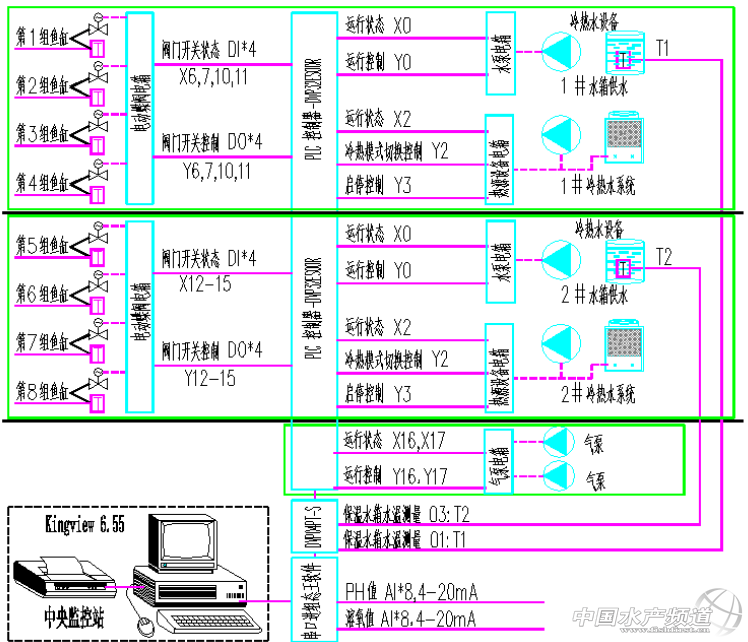 摘要:本文介紹了應用于杭州市農業科學研究院水產研究所生態實驗室自動控溫及水質參數的物聯網監控系統,包括潔凈式玻璃實驗魚缸的制作、水質潔凈系統、水質參數監控系統、自動控溫系統的實施。該生態實驗室可對同一種水生動物進行不同水質條件(溫度、pH值、溶氧值)下的生長對比實驗、生存實驗和藥物實驗;也可對不同種或不同規格的水生動物進行相同水質條件(溫度、pH值、溶氧值)下的生長對比實驗、生存實驗和藥物實驗。我們的實驗成果用以指導生產實踐,從而提高生產效率,保證生產安全。 文/圖 廣州市白云區農林局 陳柱 珠江水產研究所 謝躍帆 廣州恒心水產科技有限公司 李恒頌 中國水產頻道獨家報道,水體是水生動物賴以生存的環境,水生動物的攝食、生長、繁殖及孵化等無不受水體環境因子(如水溫、光照、pH值、溶解氧含量等)的影響。通過控制環境因子可以改善水生動物的生活環境,從而挖掘其生長潛力,提高生產效率。本文介紹的生態實驗室水族箱物聯網監控系統就是通過控制水族箱環境因子,包括水溫、pH值、溶解氧,為水生動物創造不同的環境因子,找到水生動物最適宜生活的環境因素,從而指導水產養殖的生產實踐。 一、潔凈式實驗玻璃魚缸的制作 早期玻璃魚缸的排水有兩種方式,一種是底部沒有排水管,魚缸臟了時采用水泵抽干凈魚缸內部的水,這樣的排水方式費時費力,很不方便;一種是底部接了排水管,但是接頭會露出魚缸底部,打開排水閥排水時,低于接頭部分的底部魚缸的水不能完全排干凈。對此,我們設計的潔凈式實驗玻璃魚缸在排水管的接頭位置設置了冗底式排污底板,冗底式排污底板與實驗魚缸的主底板采用玻璃膠粘接,而排水管連接在冗底式排污底板上,接管完成后,采用玻璃膠填平接頭與實驗魚缸主底板之間的空隙,這樣排水管的接頭就會略低于或平于玻璃魚缸的底板,保證打開排水閥就能排干凈實驗魚缸內所有的污水。 二、水質潔凈系統 本生態實驗室物聯網監控系統在8套魚缸的水體循環管道上配置了過濾沙缸和紫外燈,對循環水體進行了過濾潔凈和紫外殺毒,保證了實驗水體的潔凈,保證實驗安全。 三、水產養殖自動控溫智能一體機 水產養殖自動控溫智能一體機系統是將水體制冷降溫功能、水體加熱升溫功能、冷熱水循環功能、系統的安全保護控制功能集于一體的成套設備。用戶只需要連接好電源,安裝好水系統管網,排除水管網內空氣,補足水,即完成水產養殖自動控溫智能一體機系統安裝。合上空氣開關,按需求設定好水溫,按啟動鍵啟動系統即投入運行。 水產養殖自動控溫智能一體機系統采用清潔能源(電力),使用時只需要按起停按鈕,全自動運行,簡單易管理,運行安全可靠。而電熱棒加熱,電熱棒可能漏電影響生產安全;而鍋爐加熱,加熱管壁溫高,電熱棒壁溫高,如果水體淺,魚可能接觸電熱棒和加熱管而被灼傷,因此生產安全需要人工管理巡查。 水產養殖自動控溫智能一體機系統在任何季節,均可控制水溫在10-35℃范圍內的任何溫度,對池水溫度的控制精度為±1℃。溫度控制精度高,適應各種嚇、魚、龜、鱉的生長和繁殖。 水產養殖自動控溫智能一體機系統采用清潔能源(電力),不會產生煤飛、煙氣等廢物污染環境。 水產養殖自動控溫智能一體機系統運行高效,加熱費用是采用電熱棒加熱的1/3,是采用燃油加熱的1/6,是采用燃煤和燃柴的50-70%。 本生態實驗室物聯網監控系統配置了兩套水產養殖自動控溫智能一體機,將8套實驗魚缸分成兩組,可對實驗魚缸的水體進行升溫或降溫。 四、物聯網監控系統網絡圖 如物聯網監控系統網絡圖所示,本生態實驗室物聯網監控系統的設計配置如下: 1、兩套水產養殖自動控溫智能一體機的系統,可根據實驗需求制取冷水或熱水,對實驗魚缸的水體進行降溫或升溫。兩套系統的配置相同,可互相備用,根據實驗目的,通過監控電腦設定實驗需求,可對實驗水體自動升溫或降溫,控溫精度達到±0.5℃。 2、32個魚缸分8組,為每組魚缸配置了自動控溫閥,對8組魚缸的溫度、pH值和溶氧值實現了自動監控。 3、兩套氣泵系統的配置相同,可互相備用,而且自動控制氣泵系統輪換運行,每小時輪換1次。 五、實驗功能介紹 1、系統的自動監控管理功能 電腦自動監控系統實現了對魚缸水體溫度、pH值和溶氧值的自動監控記錄,我們可以根據使用需求,隨時調用某一時間段的水質參數記錄,這樣我們可以準確分析水質參數對水生動物的生長和培育的影響,盡可能找到各種水生動物的合適的生長環境。 本生態實驗室物聯網監控系統通過物聯網技術實現了對整個實驗過程的遠程監控,無論人在何處,只要可以上網,就可以通過電腦、手機遠程觀察實驗進程,遠程調用實驗記錄,根據實驗需求,遠程修改實驗條件,監控整個實驗過程,保證實驗安全。 2、實驗功能介紹 電腦監控系統監控記錄了8組魚缸的溫度、pH值和溶氧值,可以設定控制8種不同的溫度、人工調控pH值,對同種同規格的水生動物進行不同環境因子下的對比實驗。 設定好實驗需求,電腦自動監控系統實現了對魚缸水體溫度、PH值和溶氧值的自動監控 六、結論 1、無論您在何地何時,通過互聯網,本生態實驗室物聯網監控系統讓您全方位掌控整個實驗過程。 2、本生態實驗室物聯網監控系統可對水生動物的環境因子(溫度、pH值和溶氧