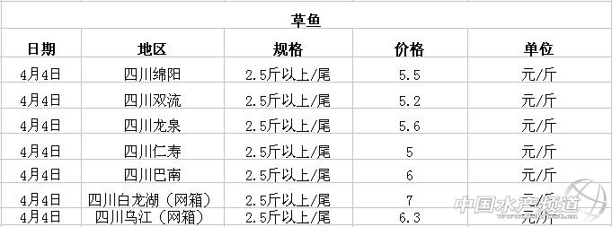 中國水產頻道獨家報道,據海大集團成都海大提供消息,4月4日各地草魚價格行情如下: