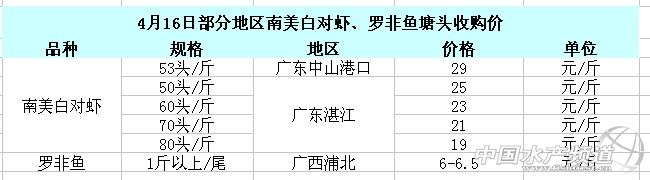 中國水產頻道獨家報道,據恒興養殖服務提供消息,4月16日全國部分地區南美白對蝦和羅非魚塘頭收購價行情如下: