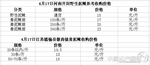 中國水產頻道獨家報道,據中國水產養殖網提供消息,4月17日河南地區和江蘇地區泥鰍收購價行情如下: